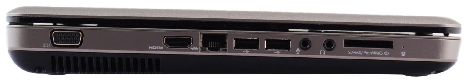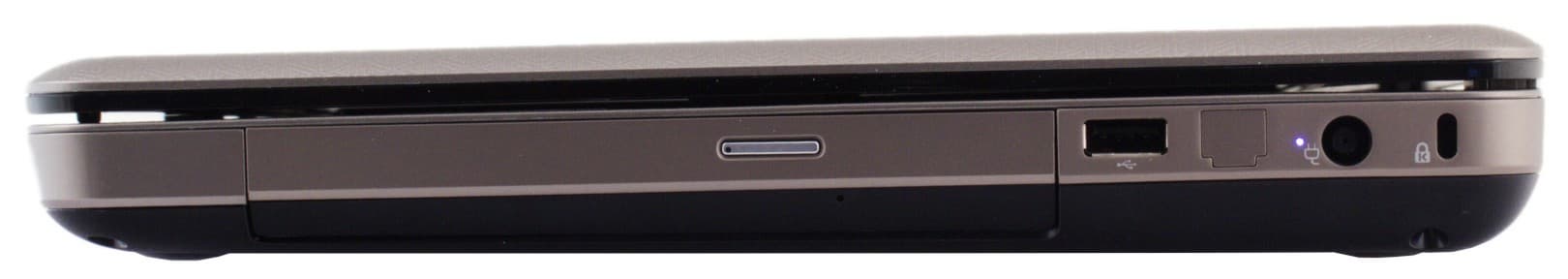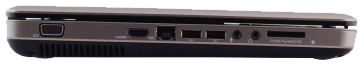 Стандартный набор интерфейсов, даже в какой-то степени минималистичный, поскольку на полноразмерных ноутбуках разработчикам вполне по силам вместить еще один USB-порт, а в ряде случаев «замахнуться» и на eSATA (тем более, что эти два интерфейса замечательно совмещаются в одном разъеме). Впрочем, когда ноутбук используется «по делу», оснащенность ноутбука всеми опциональными интерфейсами зачастую и не требуется, достаточно основных. Также на правой боковине имеется заглушка порта аналогового модема, возможно для кого-то это еще актуально и тогда имеет смысл поискать соответствующую комплектацию.