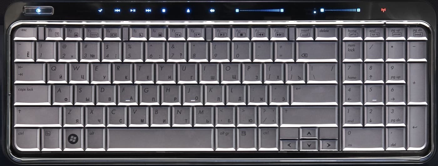 В целом, блок мультимедийных клавиш аналогичен блоку на модели 3500, которую мы рассматривали раньше, с одним отличием: тут есть вторая шкала, которая регулирует уровень басов и высоких частот. Напомню, в панели над клавиатурой находятся сенсорные клавиши, управляющие функциями мультимедиа-плеера, позволяющие отрегулировать или отключить звук, включить и выключить беспроводные сети ноутбука, а также вызвать фирменное приложение MediaSmart.
