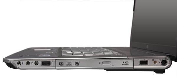 Далее идет еще один слот USB, за ним — оптический привод. Крышка привода стоит с щелями и немного ходит в пазах. За ней идет еще один слот USB, вход для антенны ТВ-тюнера и разъем для блока питания. Блок питания прямой и с довольно длинным штекером, поэтому торчать будет вбок от ноутбука.