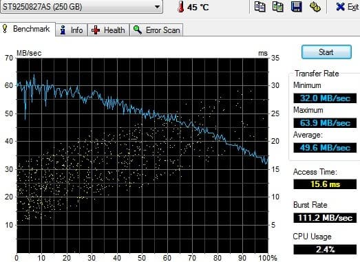 Также мы посмотрели на производительность обоих жестких дисков ноутбука. Вот данные по основному системному диску: