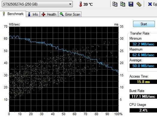 В целом, диски быстрые и обеспечивают достаточно хорошую скорость, даже минимальная скорость находится на хорошем уровне. При работе системный диск нагрелся значительно сильнее. Это может быть связано либо с местом расположения, либо с тем, что он дополнительно обслуживает запросы самой операционной системы.