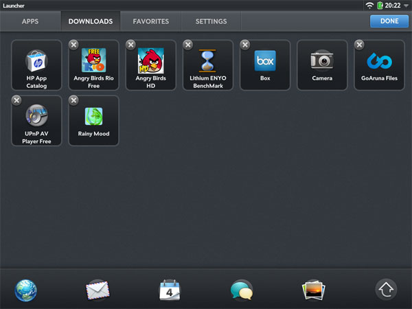 Среди предустановленных есть безымянный webOS-браузер (поддерживающий Flash), Контакты, Календарь, Messaging (приложение для общения через мессенджеры, а также для работы с SMS при условии синхронизации touch-to-share со смартфоном на webOS), Memos (приложение для заметок), QuickOffice (офисный пакет, позволяющий читать, но не редактировать документы), Музыкальный плеер, Photos&Videos (объединенный видеоплеер и демонстратор фото), Adobe Reader, Калькулятор, клиенты для YouTube и FaceBook, Карты, Часы и клиент для покупки книг на Amazon и чтения их. Также есть приложение для фотографирования и видеосъемки с помощью фронтальной камеры и, конечно, магазин приложений HP App Catalog.