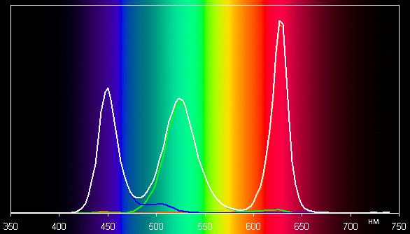 Такой спектр с тремя почти симметричными узкими и хорошо изолированными полосами по одной на каждый основной цвет характерен для мониторов, в которых используется светодиодная подсветка с раздельными красным, зеленым и синим излучателями без использования люминофоров. Именно за счет хорошего разделения компонент и достигается широкий цветовой охват.