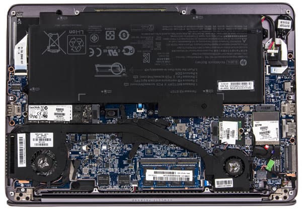 Система охлаждения ультрабука HP G1 EliteBook Folio 1040 (H5F66EA) представляет собой два радиатора с вентилятором на каждом, которые связаны тепловыми трубками с радиатором процессора.