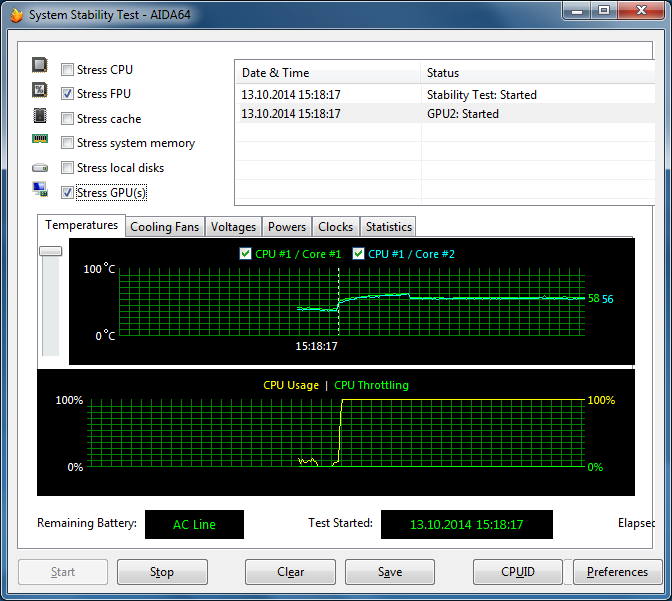 Ну а в режиме, когда одновременно загружено и графическое ядро (Stress GPU) и вычислительные ядра (Stress FPU), температура вычислительных ядер составляет 58 °С, а их частота падает до 1,1 ГГц.