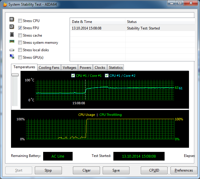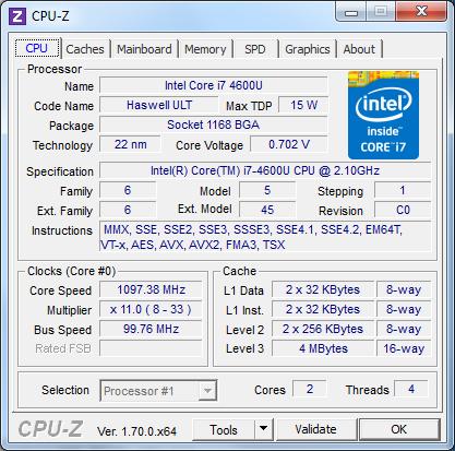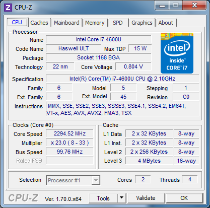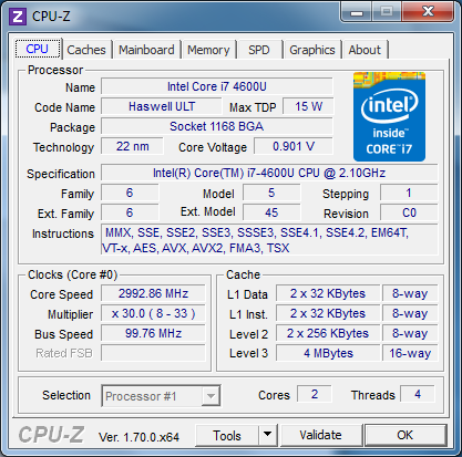 При загрузке процессора тестом Stress CPU (утилитой AIDA64 Extreme Edition — тест на стабильность системы), который использует целочисленные вычисления, частота вычислительных ядер составляет 3,0 ГГц (напомним, что для процессора Intel Core i7-4600U максимальная частота ядер может составлять 3,3 ГГц). Температура ядер в этом режиме загрузки увеличивается до 58 °С.