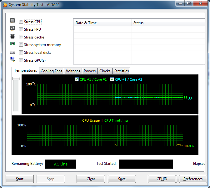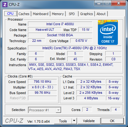 В режиме простоя, как и должно быть, частота процессора в ультрабуке составляет 800 МГц (естественно, речь идет о сбалансированной схеме энергопотребления). Температура процессора в этом режиме составляет примерно 36 °С.