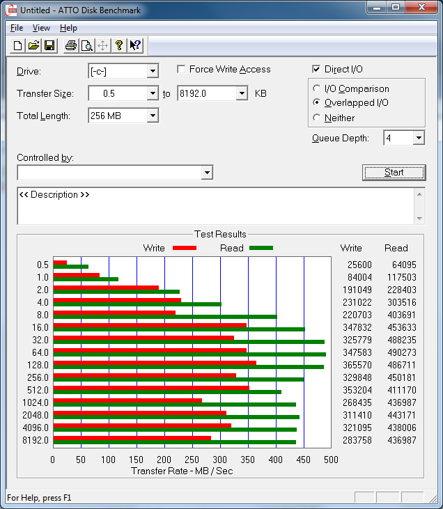 Утилита ATTO Disk Benchmark определяет максимальную скорость последовательного чтения на уровне чуть менее 500 МБ/с, а последовательной записи — на уровне чуть более 350 МБ/с. Результат очень неплохой для SSD-накопителя.
