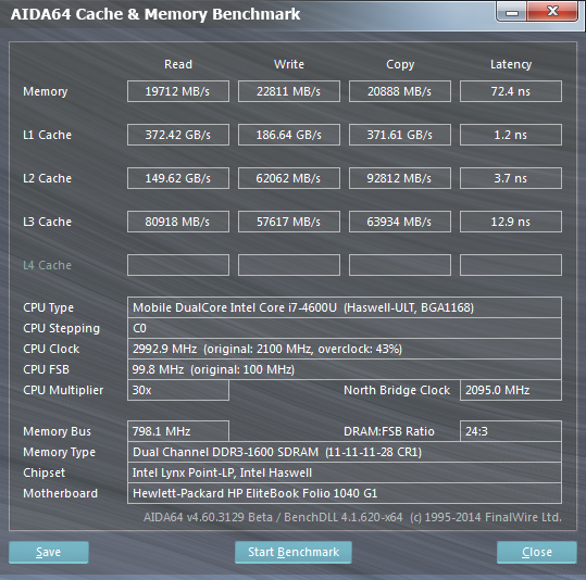 Согласно данным утилиты AIDA64 Cache & Memory Benchmark, скорость записи данных в память составляет 22811 МБ/с, а скорость чтения — 19712 МБ/с. Для памяти DDR3-1600 (пиковая пропускная способность 12800 МБ/с) в двухканальном режиме работы это вполне типичный результат.