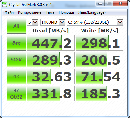 Утилита CrystalDiskMark выдает примерно аналогичные результаты: