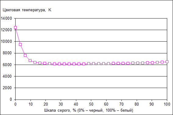 Цветовая температура ЖК-экрана очень стабильная и составляет чуть более 6000 K по всей шкале серого (возрастание температуры в темной области можно не учитывать, поскольку это может быть связано с погрешностью измерений).