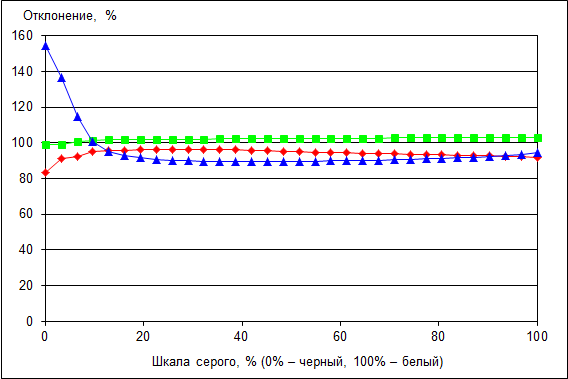 Стабильное значение цветовой температуры объясняется тем, что основные цвета хорошо сбалансированы по всей шкале серого.