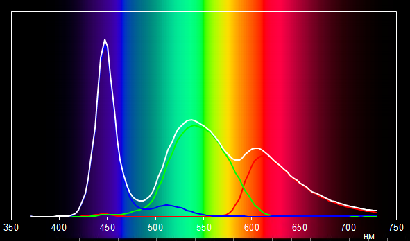 Спектры основных цветов неплохо изолированы друг от друга. И только спектры зеленого и красного цветов немного взаимно перекрываются, что впрочем, не критично.