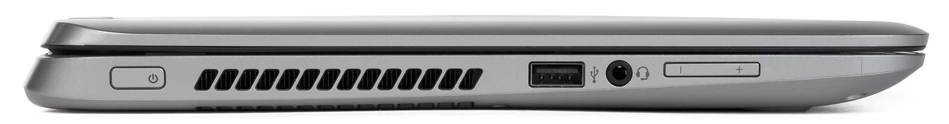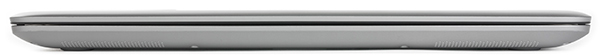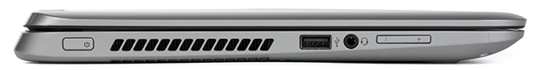 На левом торце корпуса расположены порт USB 2.0, кнопка включения, комбинированный аудиоразъем типа миниджек (наушники, микрофон), регулятор уровня громкости (клавиша качельного типа) и вентиляционная решетка радиатора системы охлаждения.
