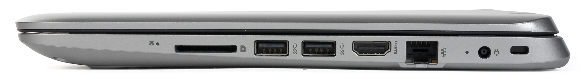 На правом торце корпуса расположены два порта USB 3.0, сетевой разъем RJ-45, разъем HDMI для подключения внешнего монитора или проектора, слот для карт памяти, разъем для подключения адаптера питания и разъем под кенсингтонский замок. Кроме того, здесь же расположен миниатюрный индикатор активности жесткого диска.