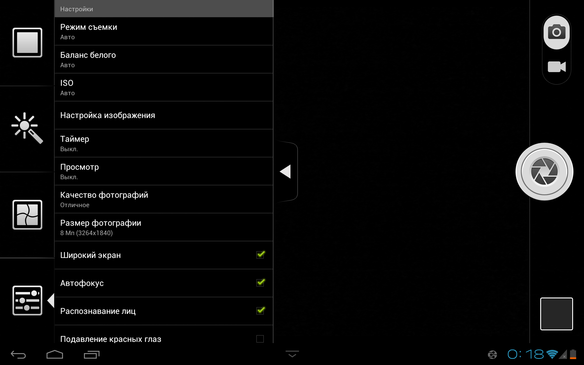 Планшет оснащен двумя камерами: фронтальная (1,3 Мп) предназначена для видеообщения, а тыловая (8 Мп) — для фотосъемки. Разрешение тыловой камеры стандартно для топовых планшетов, и, казалось бы, можно порадоваться, что на этом не стали экономить. Но качество снимков, увы, омрачает эту радость. Кстати, отметим не очень интуитивно сделанное меню настроек камеры. В нем, в частности, по умолчанию выставлен размер фотографии 6 Мп, хотя это названо 8 Мп (но в скобках указано разрешение, соответствующее 6 Мп). Оказывается, надо снять галочку с опции «Широкий экран», чтобы получить «настоящие» 8 Мп.
