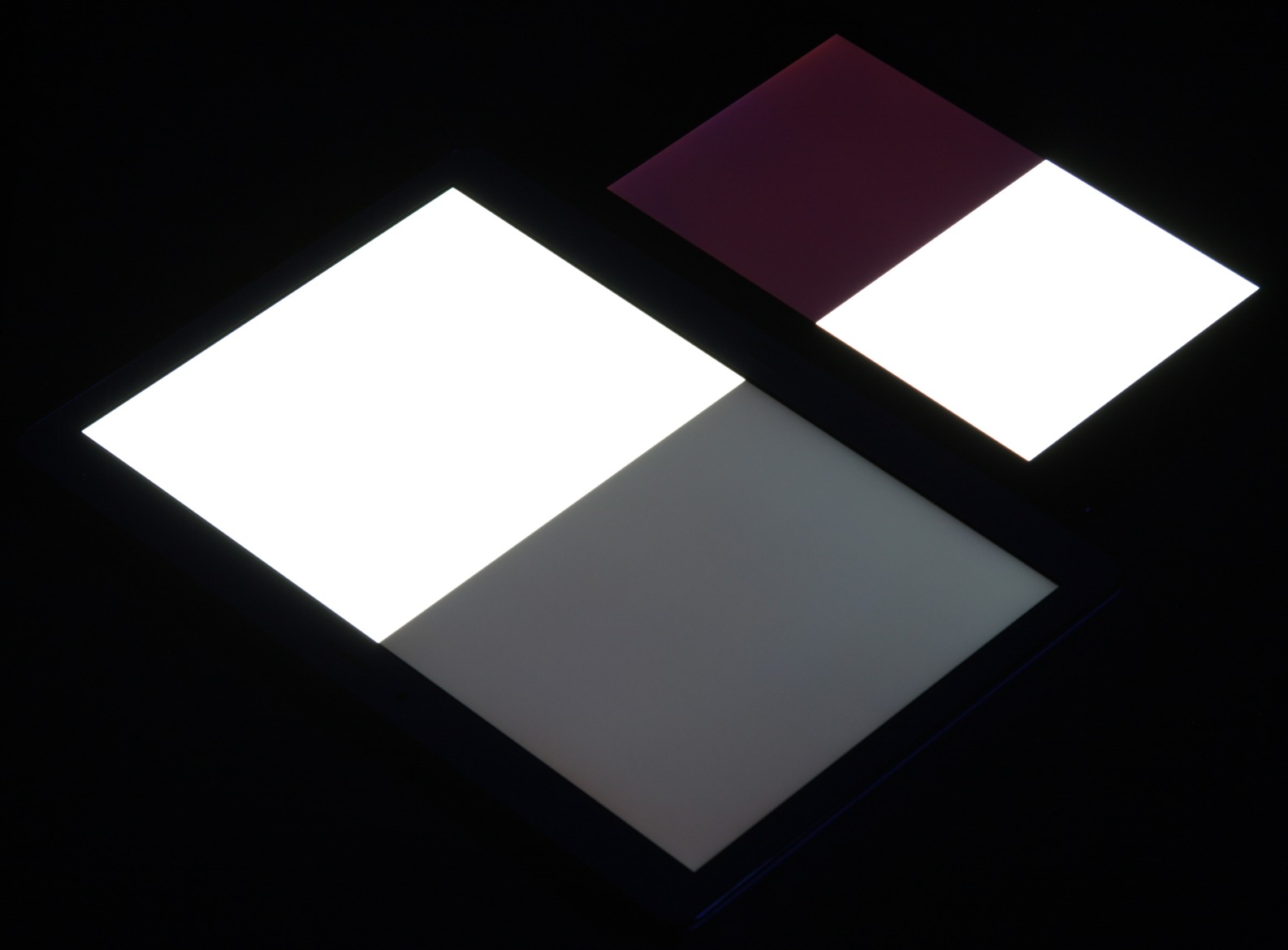 Видно, что цвета и яркостный баланс не сильно изменились у обоих планшетов, но у Huawei MediaPad M2 10.0 контраст уменьшился в большей степени из-за сильного высветления черного. Затем белое поле: