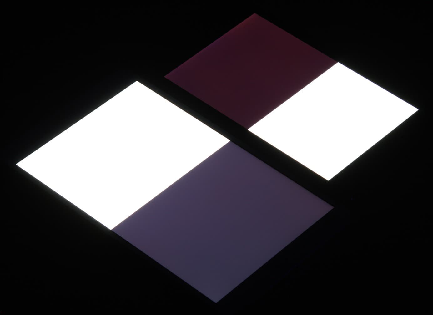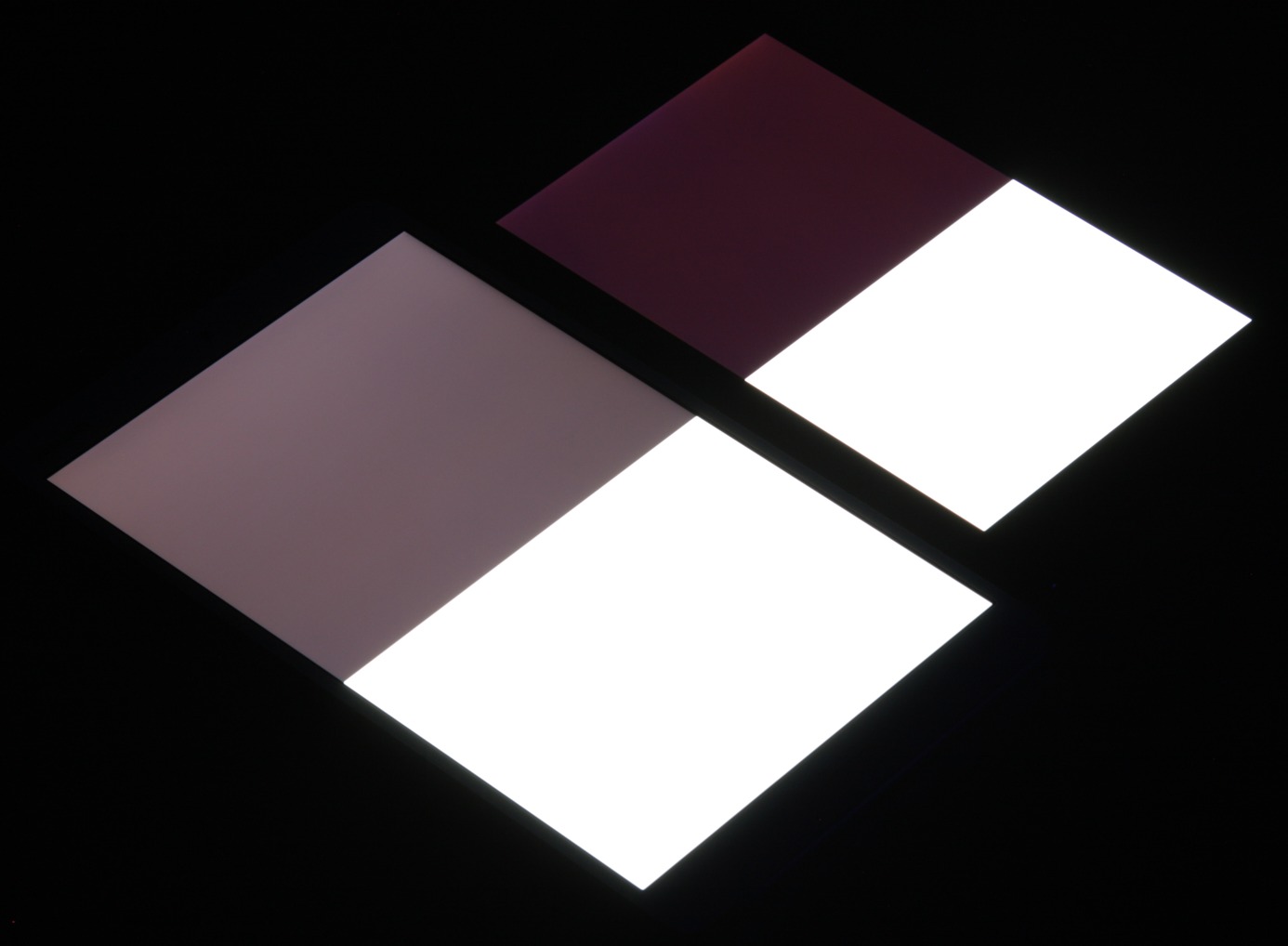 Яркость под углом у обоих планшетов заметно уменьшилась (как минимум в 5 раз, исходя из разницы в выдержке), но у Huawei MediaPad M3 яркость экрана под этим углом немного выше. Черное поле при отклонении по диагонали высветляется сильно и приобретает красноватый или фиолетовый оттенок. Фотография с Nexus 7 для сравнения это показывает (яркость белых участков в перпендикулярном направлении у обоих планшетов примерно одинаковая!):