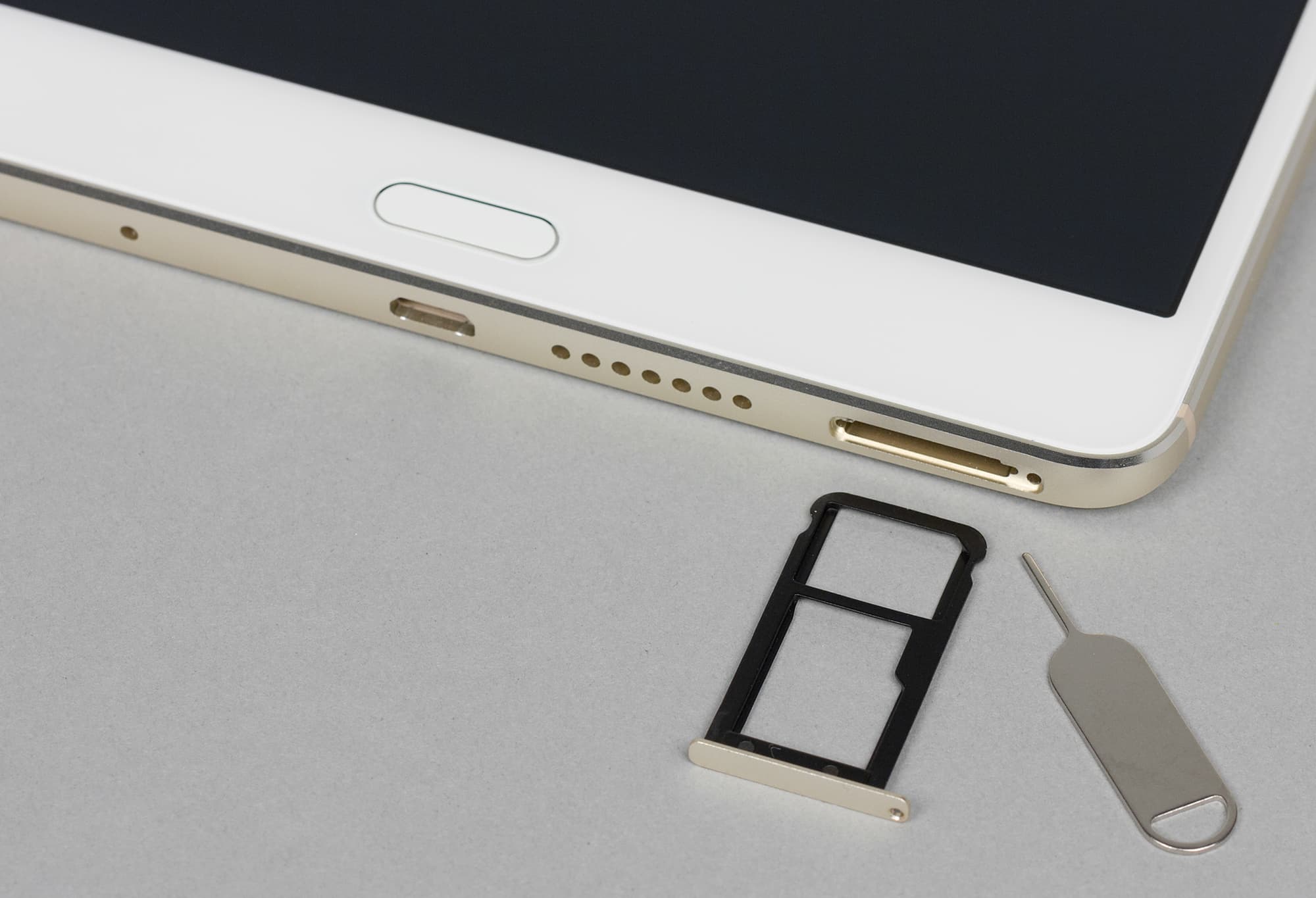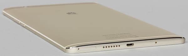 Нижний торец более всего насыщен различными элементами. Тут и решетка динамика, и разъем Micro-USB, и разговорный микрофон, и даже слот для карточек. Планшет рассчитан на установку одной SIM-карты формата Nano-SIM и одной карты памяти microSD, работать с двумя SIM-картами Huawei MediaPad M3 не может.