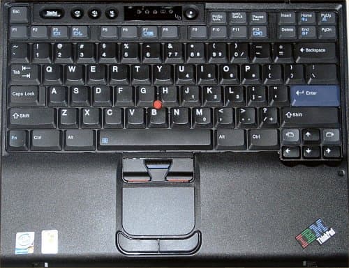 Как известно, одним из основных преимуществ ноутбуков IBM называется «правильная клавиатура». Клавиатура действительно отличается от стандартной «ноутбучной» раскладки и гораздо ближе к нормальным настольным клавиатурам. Конечно, все равно есть некоторые особенности — например, придется привыкать к другому расположению клавиши esc, кроме того, хотя блок ins/del сделан как на настольных клавиатурах, однако находится слишком далеко от курсора и при редактировании пользоваться ими совместно не очень удобно (мне часто приходится редактировать текст и там это сказывается). Однако по сравнению с другими клавиатурами такое решение однозначно удобнее. Единственное, что немножко огорчает — Fn на этой клавиатуре тоже находится в углу, в месте, более привычном для ctrl (пользоваться кнопкой Fn удобнее, однако ценой неудобно расположенного Ctrl, что, в частности, сильно влияет на переключение языков ввода при использовании Ctrl+shift). Наконец, на клавиатурах от IBM отсутствуют Windows-клавиши. Здесь следует учитывать, что за счет этого удалось увеличить кнопки alt и ctrl, так что пользоваться ими стало значительно удобнее. Еще стоит отметить кнопки forward/backward (в блоке с курсорными клавишами). Толку от них особого нет, особенно если учесть, что они не перенастраиваются, а путаешься из-за них при пользовании курсором изрядно. Однако в целом эта клавиатура значительно удобнее, чем клавиатуры всех остальных ноутбуков, и обладает, пожалуй, одной из лучших раскладок (а если бы ctrl был на месте — то однозначно лучшей без вопросов). Что касается нажатия, то после небольшого привыкания оно не доставляет никаких неудобств. Клавиши нажимаются достаточно мягко, с тихим щелканьем.