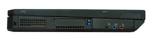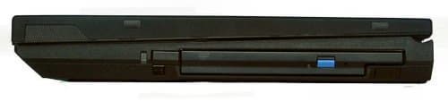 Правая сторона немного интереснее. Итак, мы видим оптический привод с синей кнопкой выброса, слева от него — рычажок выброса устройства из Ultrabay, рядом — индикатор питания. Инфракрасный порт находится слева от дисковода под лотком.
