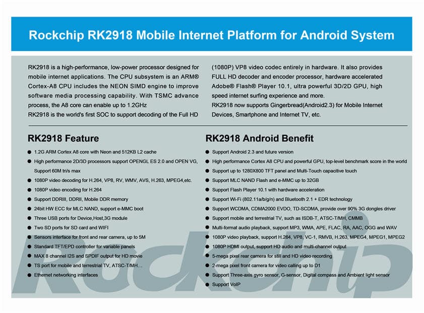 Планшет работает на недавно анонсированном чипе Rockchip RK2918, имеющем архитектуру ARM Cortex-A8. Данный процессор является наиболее «свежей» разработкой, и в первую очередь он примечателен тем, что имеет возможность аппаратного декодирования кодека VP8 (VP8 — это основной формат для HTML5-видео, называемый также WebM). Подробную информацию о прочих умениях данного процессора можно прочитать в следующей листовке: