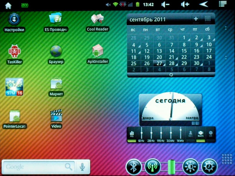 Наверное, расписывать Андроидные особенности в рамках данной статьи не имеет никакого смысла, скажем лишь, что на планшете установлена версия Android 2.3.1. Имеющиеся по умолчанию приложения охватывают всё необходимое для обычного повседневного использования устройства. Впрочем, вряд ли кто-то ограничится скромным набором стандартных приложений, и наверняка через несколько суток активной эксплуатации планшет окажется полностью укомплектованным по вкусу и разумению пользователя.