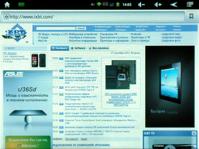 Быстрая прокрутка и плавное масштабирование веб-страниц, даже сложных, напичканных флэш-графикой и видео, признаться, удивили, напомнив работу мощного домашнего ПК. Наверное, за такую плавность следует благодарить электронную начинку?