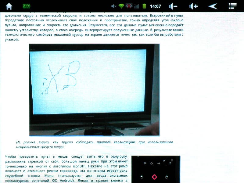 Устройство имеет одно досадное ограничение: зарядка аккумулятора устройства может осуществляться только с помощью адаптера питания (прилагаемый адаптер даёт ток в 5 В и 2 А). По шине USB аппарат не заряжается. Отчего так? Видимо, особенности конструкции. И второе разочарование: сколько мы ни пытались, но получить права root так и не удалось (это устройство пока ещё отсутствует в Android SDK). В связи с этим скриншоты экрана для данной статьи придётся делать по старинке: фотоаппаратом.