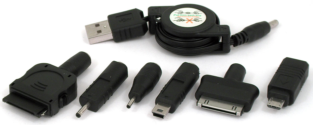 Эти переходники охватывают немалую часть распространённой сегодня мобильной аппаратуры, такой как плееры и телефоны, карманные игровые приставки и смартфоны, фотоаппараты и некоторые модели видеокамер. Главным связующим звеном в цепочке служит кабель-переходник, провод которого сворачивается в подпружиненную ракушку — удобно и компактно. Штекер, имеющий форму USB, вставляется в рассматриваемый источник питания, а к разъёму на другом конце провода подсоединяется нужный переходник — практично и быстро.