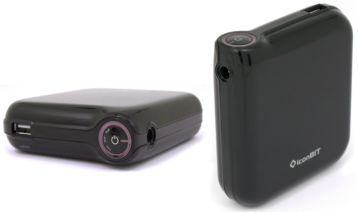 Корпус устройства изготовлен из глянцевого прочного пластика. При внимательном взгляде можно заметить, что он собран из нескольких частей (дно и крышка плюс связующий центральный элемент); соединение этих частей жёсткое, не наблюдается ни малейшего люфта. На одном из торцов имеется вход для подключения прилагаемого адаптера питания — таким образом подзаряжается встроенный аккумулятор (этот вход так и промаркирован: DC In). На верхней грани устройства (будем считать её верхней) находится выход питания, выполненный в виде USB-порта. Неудивительно, что маркировка здесь другая: USB Out.