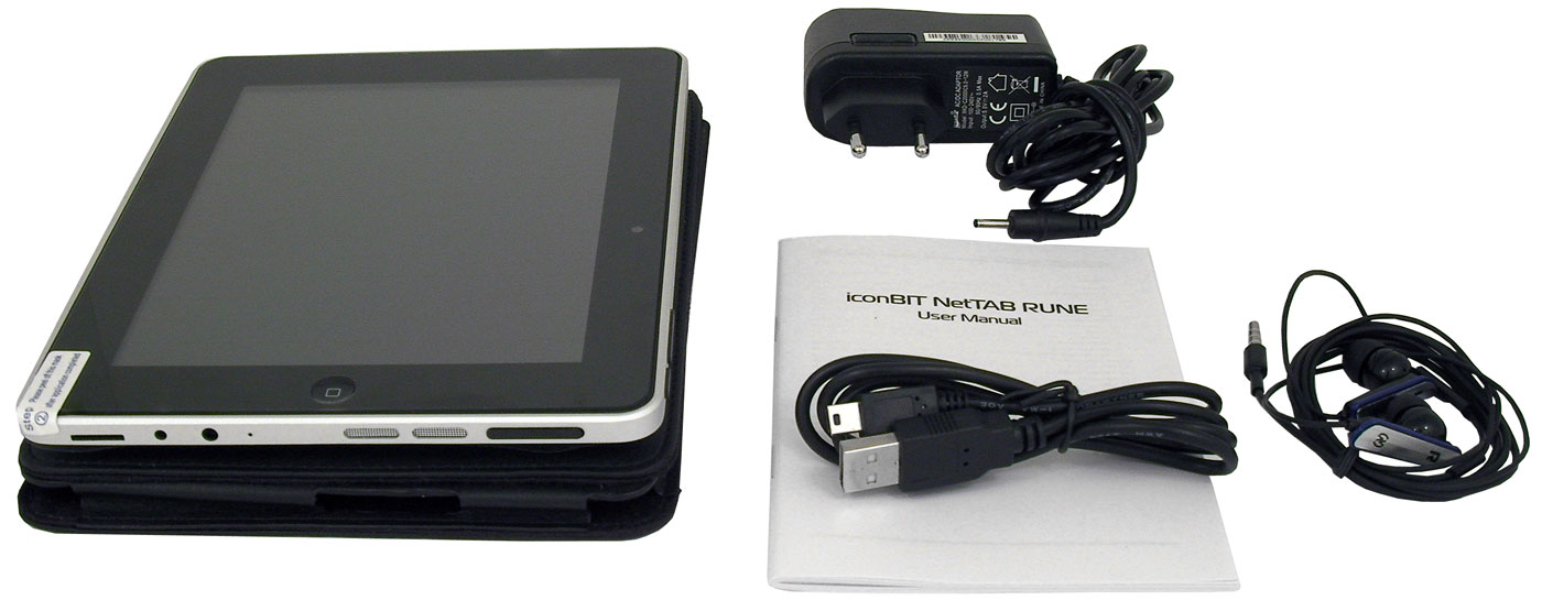 Комплектность аппарата довольно скромная, но включено в неё всё самое необходимое. Планшет, чехол из кожзаменителя, адаптер питания для подзарядки батареи устройства, USB-кабель, наушники с микрофоном и краткая инструкция по эксплуатации.