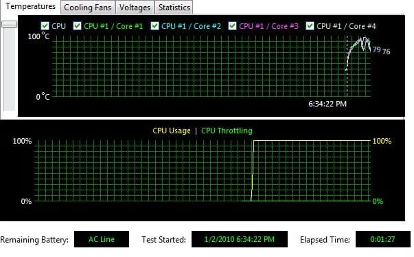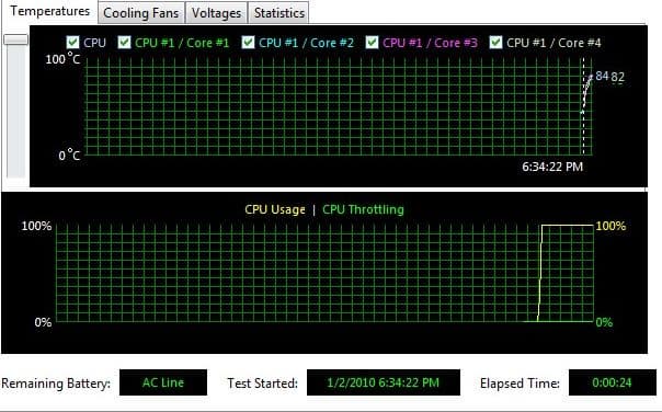 Через 24 секунды она дошла до 84 градусов. Но рост температуры замедляется. Чем больше разница температур процессора и окружающей среды, тем проще системе охлаждения поддерживать температуру. Вентилятор, разумеется, уже давно работает на полную мощность.
