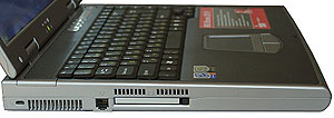 Некоторые комментарии. Расположение разъемов не кажется мне особенно удачным. Разъем PS/2 расположен вроде бы удобно, но окно инфракрасного порта находится слишком близко от него. К тому же телефонный кабель подключается к противоположному "борту" получается, что провода подходят к корпусу со всех сторон. Разъем IEEE1394 мало того, что расположен на задней поверхности, он еще и спрятан за сетевым шнуром и кабелем источника питания (в "стационарном" варианте эти кабели практически всегда подсоединены). Так что единственный разумный вариант его использования оставлять постоянно воткнутый "хвост", что в принципе не очень хорошо. Про порты USB я говорил уже столько, что повторяться не буду. Но пользоваться USB-дисководом при таком подключении неудобно.