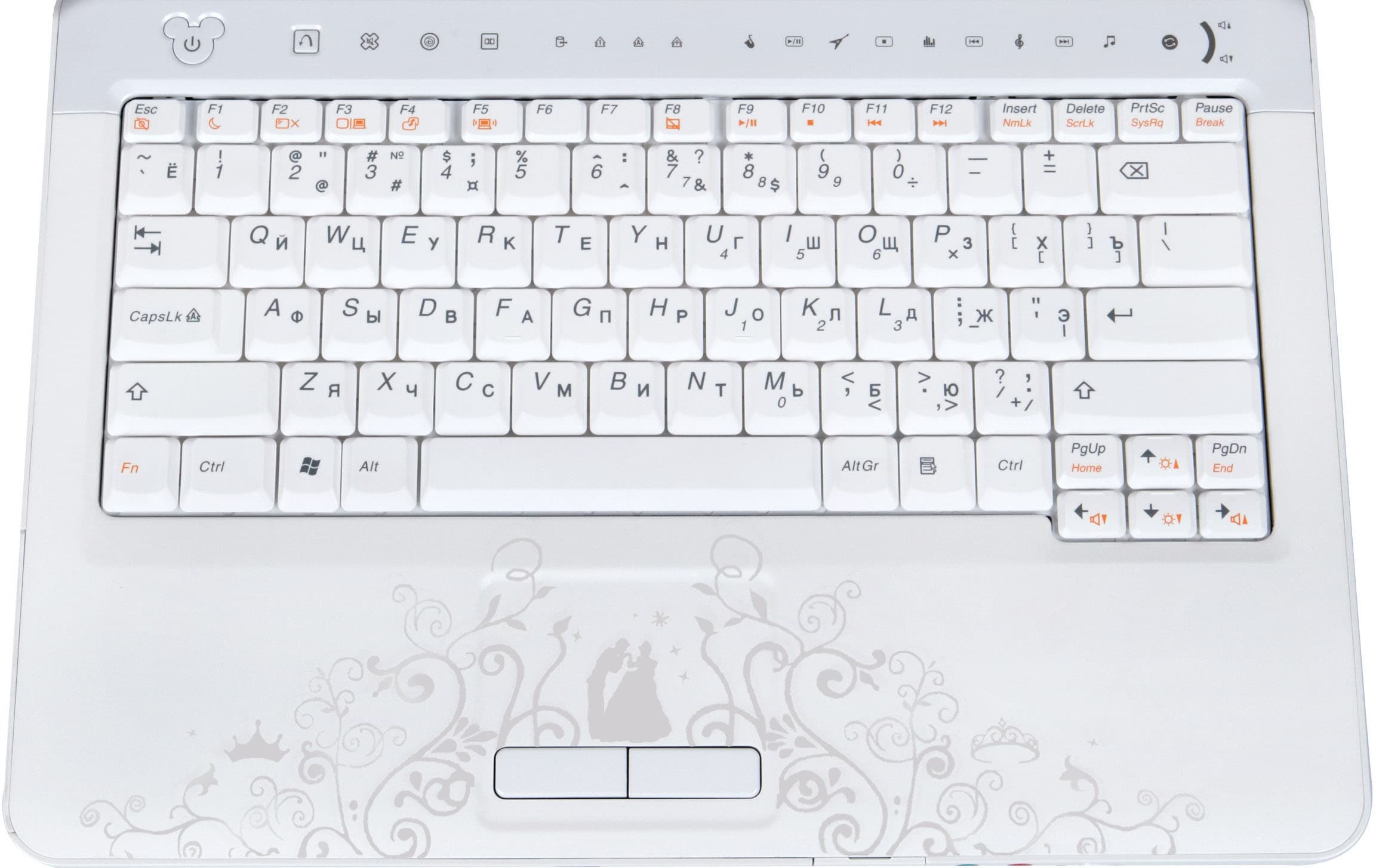 И здесь, конечно, сразу бросается в глаза оформление крышки ноутбука. Прихотливый узор, складывающийся в изображение замка Золушки, отлично смотрится на мягком жемчужном фоне. Диснеевская тема затронута и в оформлении клавиатуры и области тачпада. Так, клавиша включения / выключения ноутбука выполнена в форме головы Микки Мауса, а над кнопками мыши мы видим принца и прицессу.