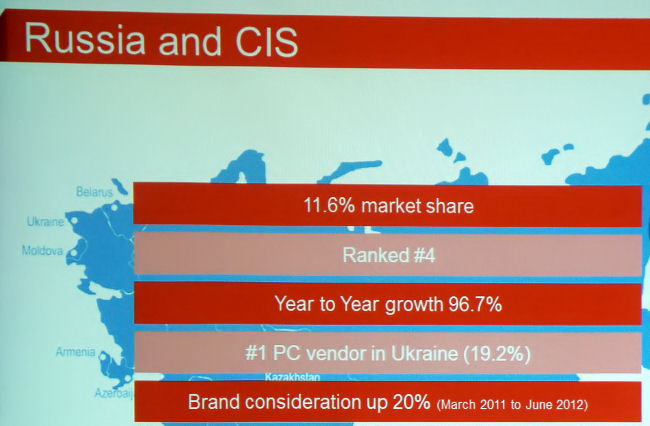 По информации, предоставленной компанией Lenovo, ее доля на глобальных рынках устойчиво растет и за год (2011-2012) выросла почти на 4%. Компания уже достигла второго место по уровню общих поставок мирового уровня, а на некоторых географических рынках и в некоторых сегментах уверенно лидирует. Однако Lenovo не собирается останавливаться на достигнутом и ставит перед собой амбициозные планы стать номером один по рынку в целом через пять лет.