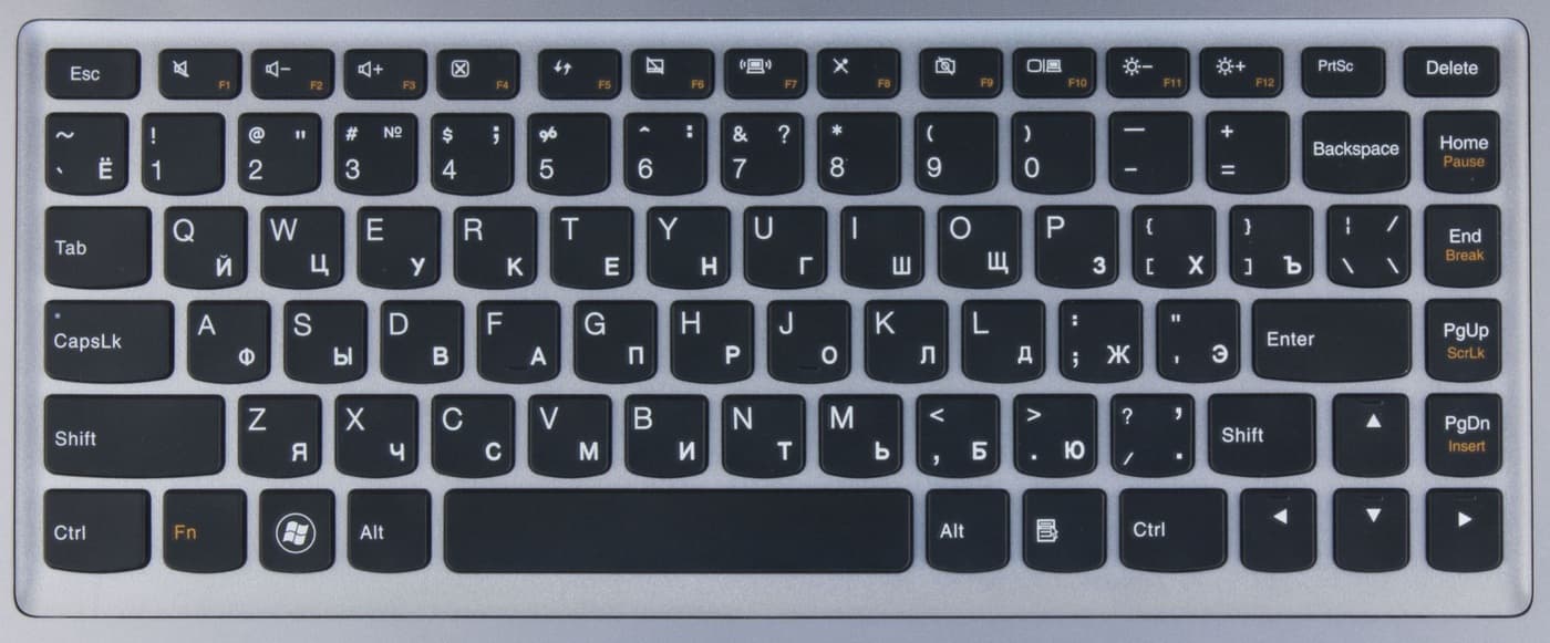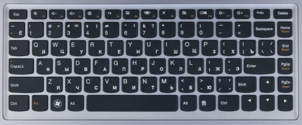 Управление ультрабуком осуществляется традиционно — с помощью клавиш верхнего ряда Fx. В Lenovo Ideapad U310 и U410 эти клавиши по умолчанию работают именно для функций управления ноутбуком, а чтобы получить традиционные Fx, надо использовать их с клавишей Fn.
