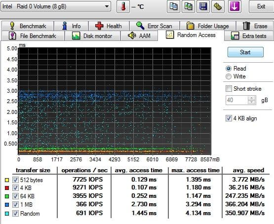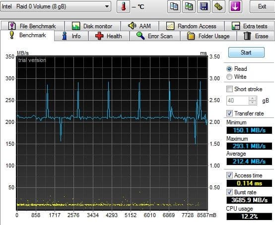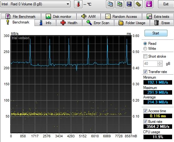 Скорость на этом этапе по современным меркам (для SSD) обычная, в среднем 215 МБ/с при очень низком времени доступа. В принципе, этого должно хватать для обеспечения быстрой и беспроблемной работы ультрабука.