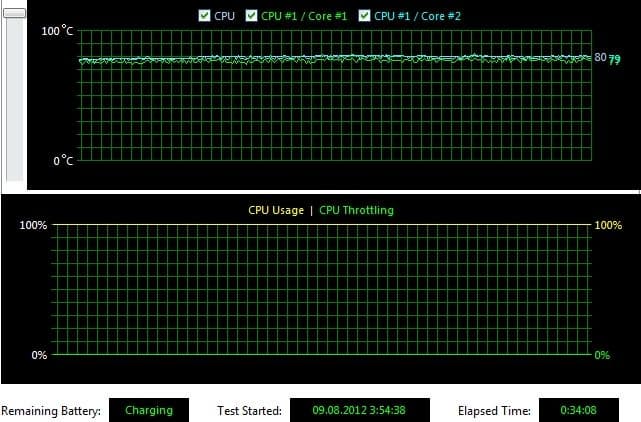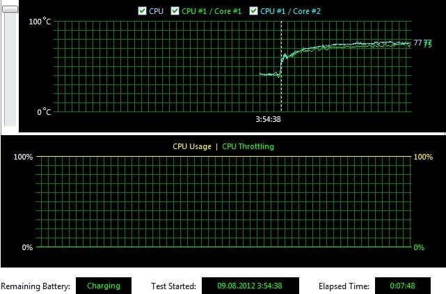 Таким образом, оба ультрабука с ультрамобильными процессорами Core i5-3317U ведут себя примерно одинаково. Под нагрузкой они набирают максимально возможную частоту (когда загружены все ядра, она составляет 2,4 ГГц) и способны удерживать ее в районе 20 секунд. После этого они скидывают частоту до номинальной, т. е. 1,7 ГГц, на которой работают дальше, причем система больше не пытается поднять частоту. Температура продолжает расти даже после сброса частоты и стабилизируется в районе 80 градусов.
