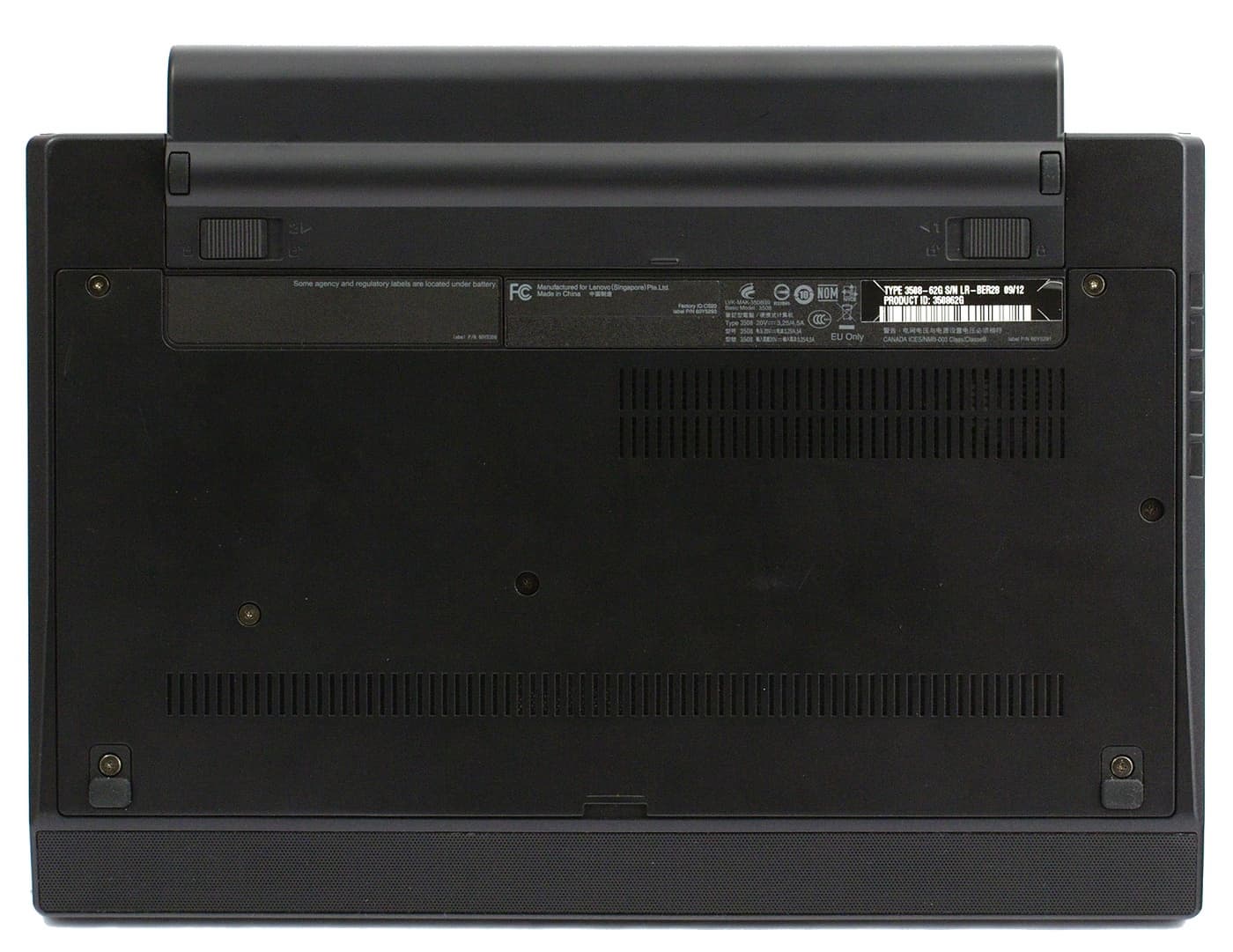 Нижняя крышка корпуса абсолютно плоская, и из-за недостатка места, например, наклейку с MAC-адресами перенесли внутрь корпуса. Большой плюс, что нижняя крышка корпуса здесь сделана из того же материала, что и остальные панели, поэтому ноутбук смотрится гармонично, особенно когда держишь его в руках. А то часто бывает так, что верхняя крышка у ноутбука красивая и из хорошей пластмассы, а дно сделано не пойми из чего и портит все впечатление.