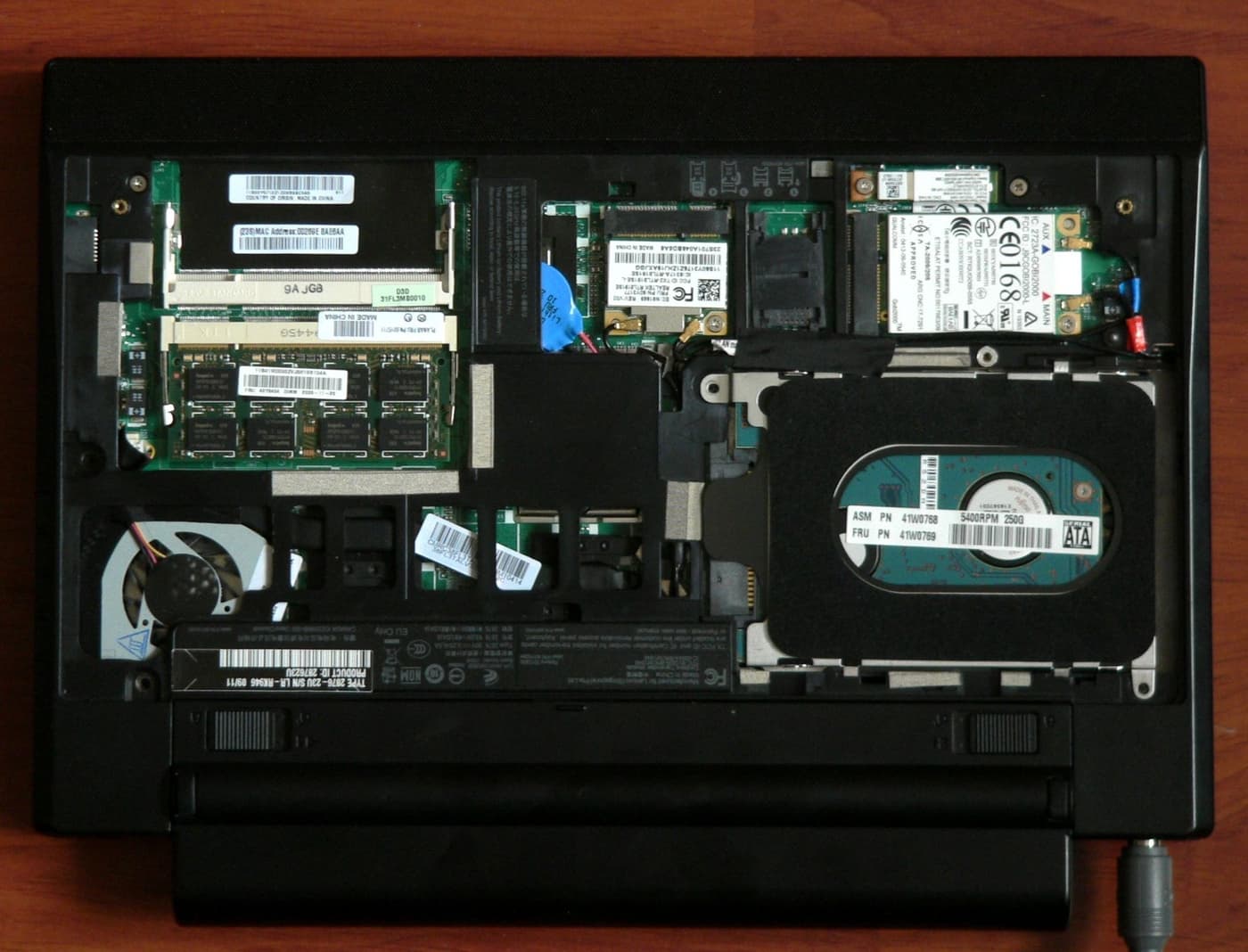 Нижняя крышка у ноутбука единая, открутив семь винтов под о-очень маленькую крестовую отвертку (винты закреплены в корпусе, т.е. остаются в крышке и их нельзя потерять: это маленькая деталь, но она показывает заботу о пользователе, которому для апгрейда придется раскручивать ноутбук самому), получаешь доступ к внутренностям. Из плюсов можно отметить, что сразу получаешь доступ ко всему. Здесь и оперативная память (два слота, у нас занят один, под вторым, пустым — наклейка с MAC-адресом карты), и две беспроводных карты (каждая со своими двумя антеннами), между ними — гнездо для SIM-карты сотового модема (такое чувство, что он разведен на системной плате) и жесткий диск (установлен в обычной жесткой корзине, без амортизаторов, впрочем, тут есть акселерометр). Из минусов — хоть вентилятор системы охлаждения и видно, но так просто до него не доберешься: надо разбирать корпус дальше.