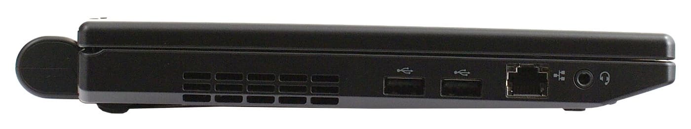 На левой стороне — решетка вентиляции, два порта USB, разъем проводной сети и единственный аудиоразъем «для гарнитуры», сочетающий в себе выход на наушники и микрофонный вход.
