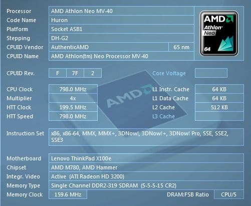 | Процессор | AMD Athlon Neo Mobile Processor MV-40 | AMD Athlon Neo MV-40, 1600 MHz (8 x 200) |