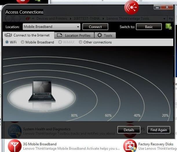 Вторая интересная программа — Access Connections 5. Благодаря этой утилите можно легко формировать профили для беспроводных подключений и переключаться между ними. Правда, в ее использовани на Х100е есть одна особенность. По FN+F5 вызывается не стандартный удобный менеджер беспроводных соединений, а другая утилита, которая всего лишь позволяет включать или выключать интерфейсы. Кроме того, ее не хватает — приходится еще включать их дополнительно через интерфейс Windows. В то же время, Access Connections в Х100е установлен, но не вызывается по нажатию обычного для других моделей ThinkPad клавиатурного сочетания.