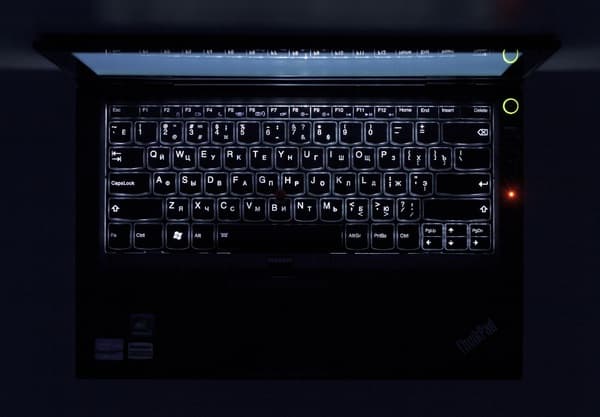 Для Lenovo Thinkpad X230 доступны целых два вида подсветки клавиш. Во-первых, в этом ноутбуке всегда есть традиционная подсветка Thinklight — светодиод в верхней рамке экрана, который светит на клавиатуру. Его плюсы известны: рассеянный мягкий свет на клавиатуре, позволяющий, помимо прочего, положить поверх клавиш документ и прочитать его. Основной минус — при печати руки отбрасывают на клавиатуру тень, так что надписей на клавишах не видно.