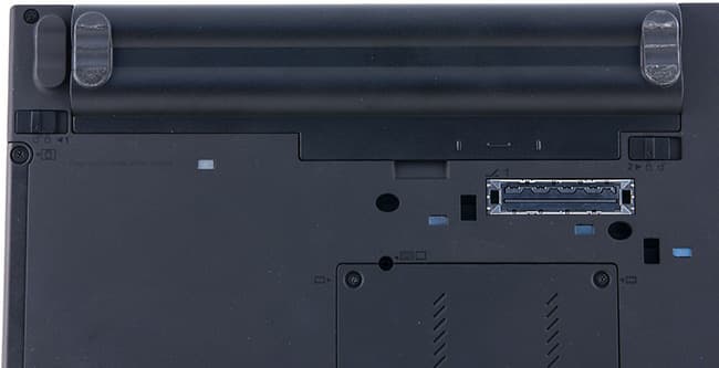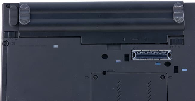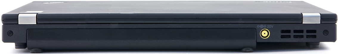 Если вы постоянно работаете с ноутбуком и он все время подключен к сети, это удобно: штекер и шнур питания сзади, ничего не торчит, все чисто и аккуратно. Однако если вы часто переносите свой X230, то начинаются проблемы. Например, пришли вы с работающим ноутбуком в руках и сели за стол — так просто воткнуть разъем не удастся. Скорее всего, придется снова встать, наклонить крышку вперед и заглянуть за нее — лишь тогда удастся включить его в сеть. Теоретически можно повернуть ноутбук вбок, но он будет упираться своими ножками. В общем, подключать штекер неудобно. От этой напасти спасает док-станция — тех, у кого она есть. Остальную часть задней панели занимают решетка вентиляции и крышка батареи.