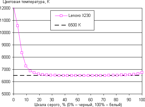 Отклонение от спектра абсолютно черного тела (дельта Е) относительно большое, порядка 10 (за счет избытка зеленой компоненты, что также повышает яркость экрана). Однако для устройства, не предназначенного для непрофессиональной работы с цветом, это считается допустимым. При этом ΔЕ мало изменяется при переходе от белого к темным оттенкам серого, что очень хорошо и имеет большее значение для визуальной оценки цветопередачи, чем абсолютные значения:
