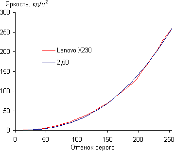 В данной модели используется матрица типа IPS, в результате экран имеет очень хорошие углы обзора без инвертирования оттенков и без значительного сдвига цветов даже при больших отклонениях взгляда от перпендикуляра к экрану. Правда, что характерно для любой IPS-матрицы, черное поле при отклонении по диагонали высветляется, и высветляется очень сильно. При отклонении по диагонали вверх черное поле становится светлее, но остается близким к нейтрально-серому, при отклонении по диагонали вниз фиолетовый оттенок выражен гораздо сильнее. При перпендикулярном взгляде равномерность черного поля средняя, из-за нескольких участков с повышенной яркостью впритык к рамке экрана. Контрастность в центре экрана равна 720:1, что соответствует типичной IPS-матрице. Построенная по 32 точкам гамма-кривая не выявила завала ни в светах, ни в тенях, а показатель аппроксимирующей степенной функции получился 2,50, что больше стандартного значения в 2,2, при этом реальная гамма-кривая немного отклоняется от степенной зависимости: