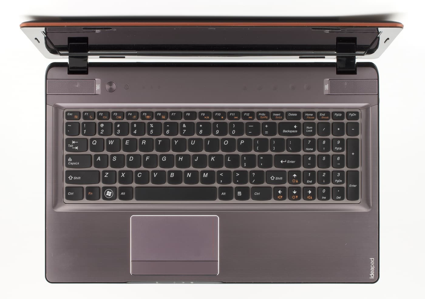 Несмотря на оригинальную текстуру и оранжевую кайму, крышка производит вполне спокойное впечатление и не должна надоедать при длительном использовании ноутбука. Ну а мы посмотрим, что у Lenovo Ideapad Y570 внутри.