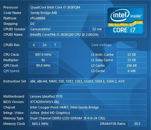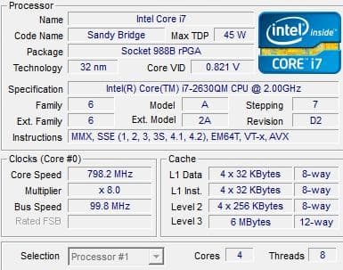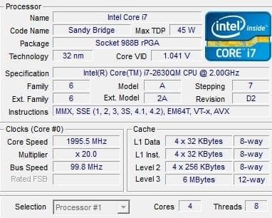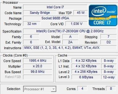 | Процессор | QuadCore Intel Core i7-2630QM, 2600 МГц (26×100) | |